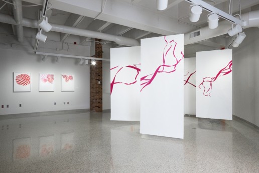 In the foreground is a beaded mask with a colorful butterfly motif placed on a black mannequin head form. In the background on three different walls that are turquoise green hang large, colorful, knotted rope works. In the midground to the right is a beaded sculpture with blue and white circular motifs that rests on a turquoise green pedestal.